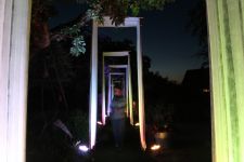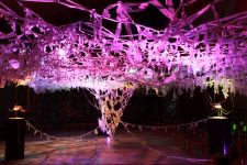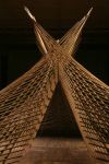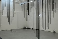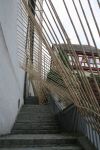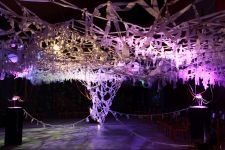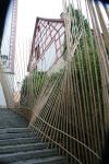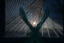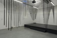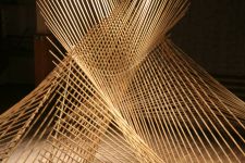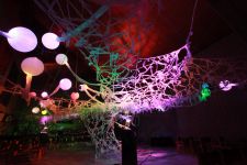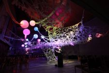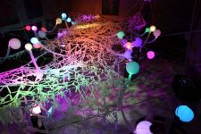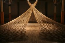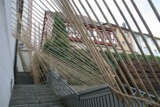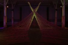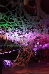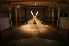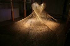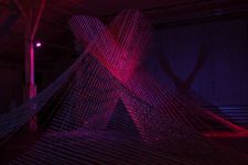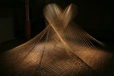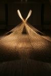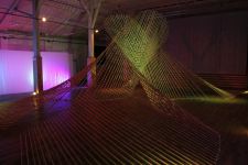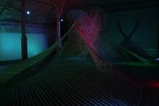 Alles ist mit allem verbunden und lässt sich beliebig erweitern und verändern. Dieses Netzwerk wächst über den Innenraum hinaus ins Freie in den Außenraum und in Bäume hinein, die wiederum mit ihrem Astwerk Teil der Gesamtstruktur werden. An manchen Stellen ist das Netzwerk eng und undurchsichtig, an anderen Stellen offen und löchrig.